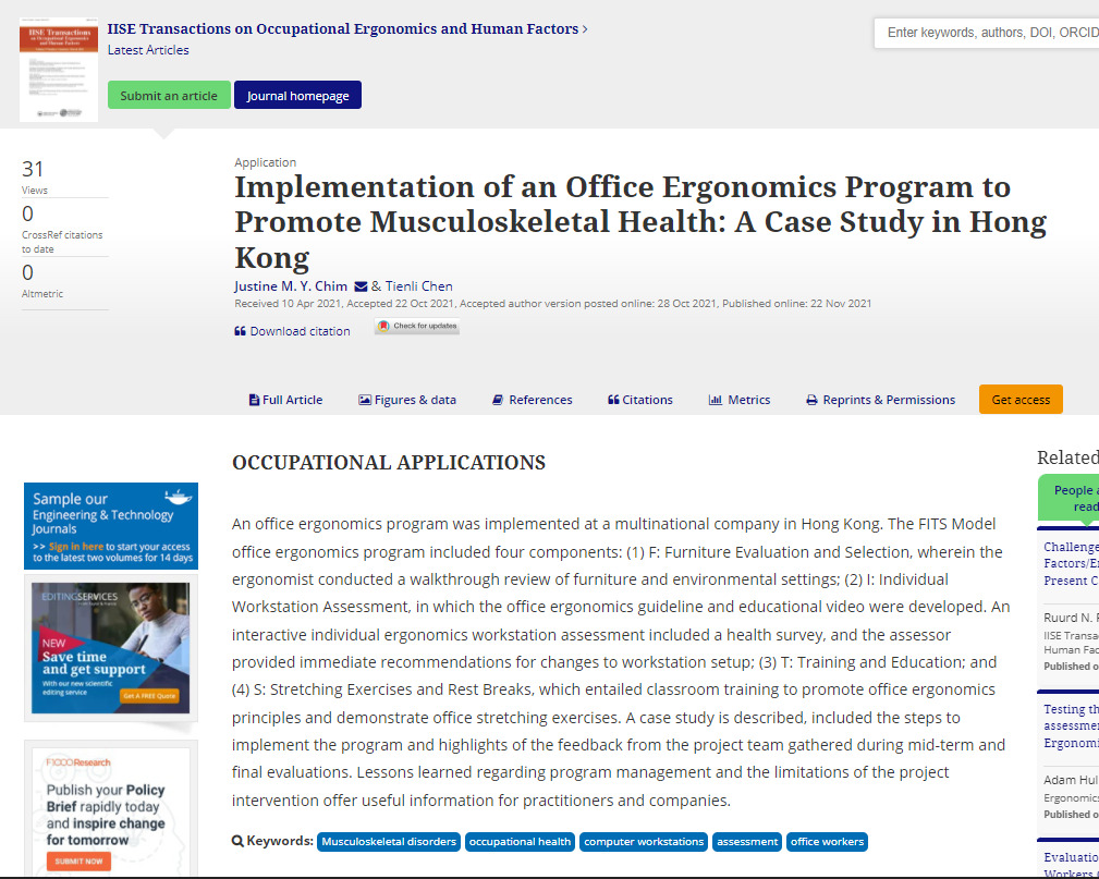 Journal Article: Implementation of an Office Ergonomics Program to Promote Musculoskeletal Health: A Case Study in Hong Kong