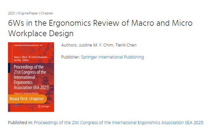 IEA 2021 Paper: 6Ws in the Ergonomics Review of Macro and Micro Workplace Design (Published by Chim, J. M.Y., & Chen, T. (2021, June))